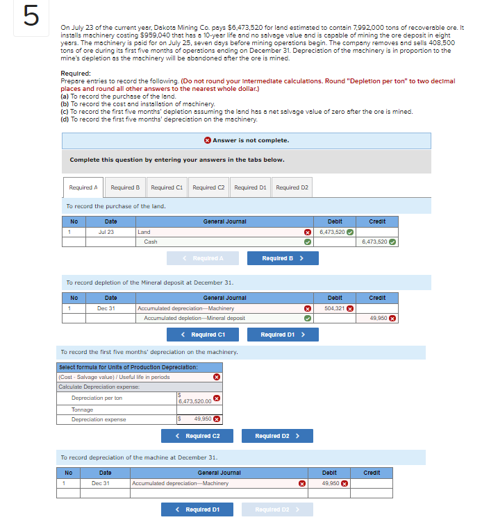 It installs machinery costing 410000 that has a 10-year life and no salvage value and is capable of mining the ore deposit in eight years. On July 23 of the current year Dakota Mining Co. Pays 5878560 for land estimated to contain 7944000 tons of recoverable ore.